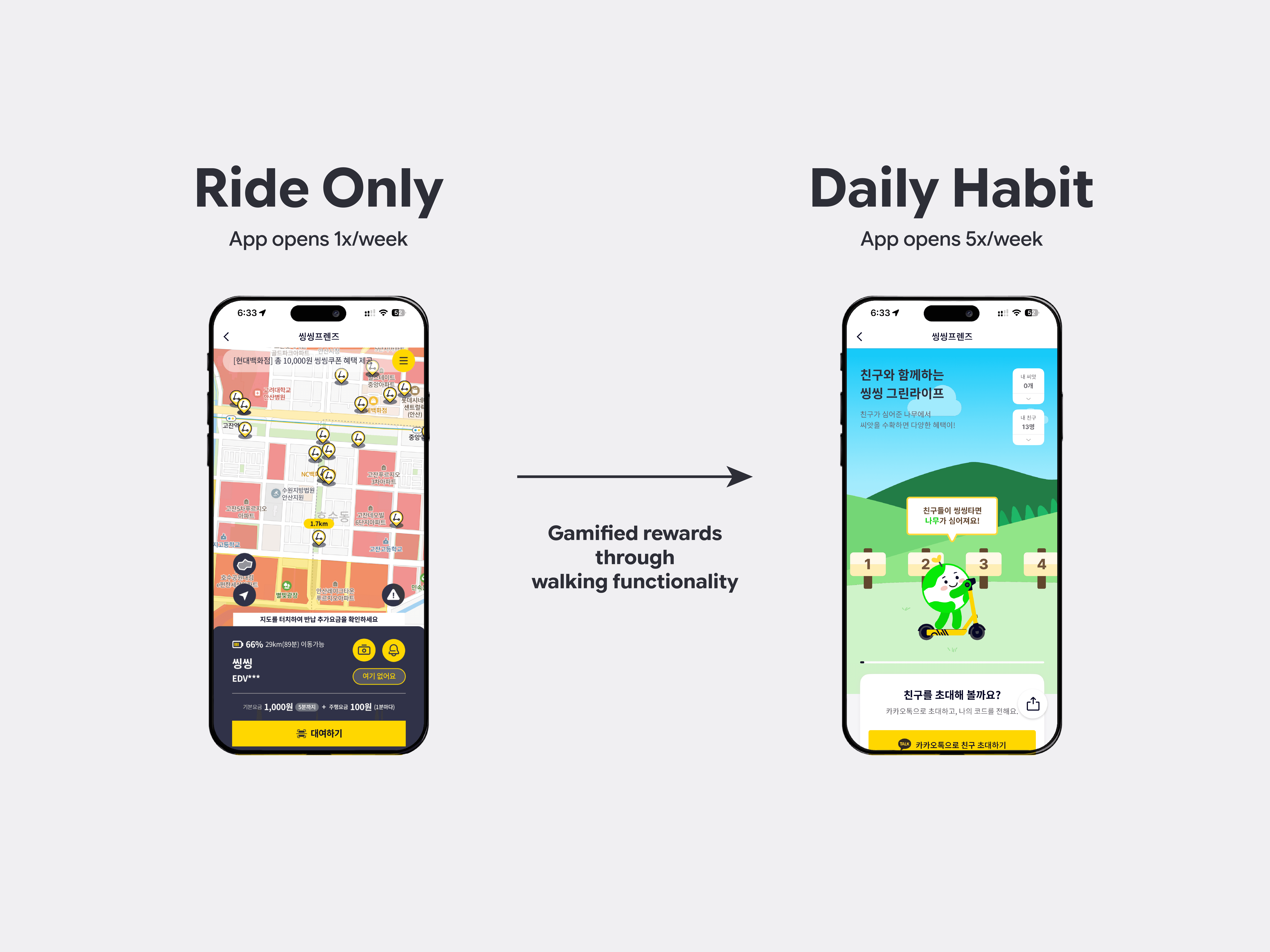 The challenge was to overcome the app's low retention during off-peak hours. We needed to transform the user perception from "an app I only open to ride" to "a fun daily habit." The visual experience had to be engaging enough to motivate users to walk and check the app repeatedly.